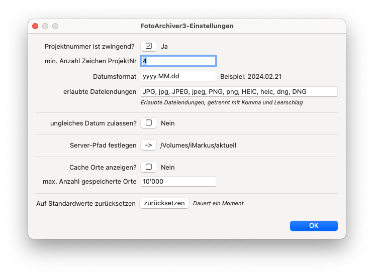 Der Pfad zum Projektordner auf dem Server und weitere Einstellungen, können unter dem Menue 'Einstellungen',