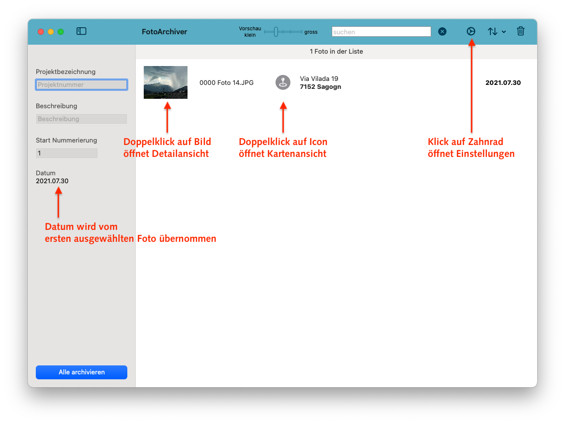 Die Fotos werden von FotoArchiver3 beim Archivieren zuerst in den Ordner FotoArchiver im HomeDirectory/Bilder verschoben,